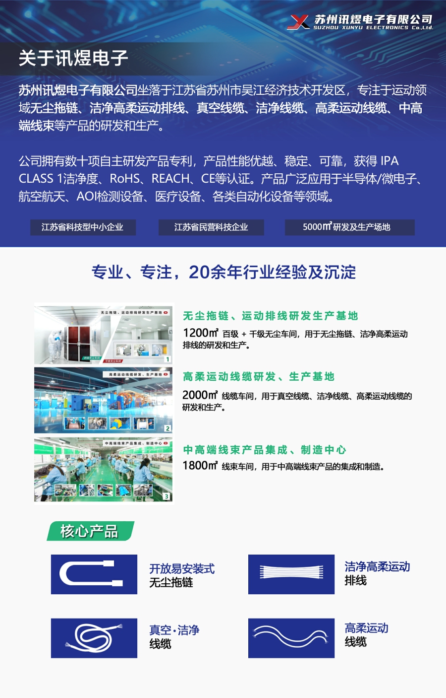 經(jīng)過20多年的沉淀與發(fā)展,目前訊煜電子已經(jīng)發(fā)展成為一家集無塵拖鏈、潔凈高柔運(yùn)動排線、真空線纜、潔凈線纜、高柔運(yùn)動線纜、中高端線束等產(chǎn)品的研發(fā)、生產(chǎn)、集成為一體的高科技企業(yè)。
