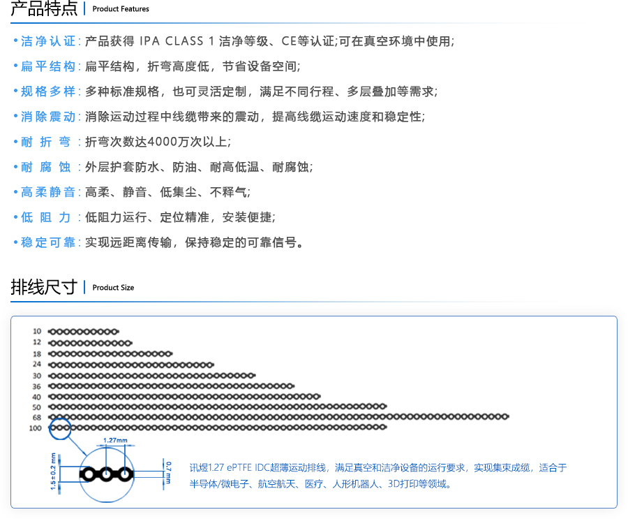 訊煜電子自主研發(fā)的1.27 ePTFE IDC潔凈運動超薄排線采用潔凈、高柔材料(潔凈等級為IPA Class1,運動次數(shù)達數(shù)千萬次),工藝上實現(xiàn)集束成纜,支持刺破式壓接,產(chǎn)品性能滿足真空和潔凈設備的運行要求,是運動超薄排線領域的又一次創(chuàng)新!